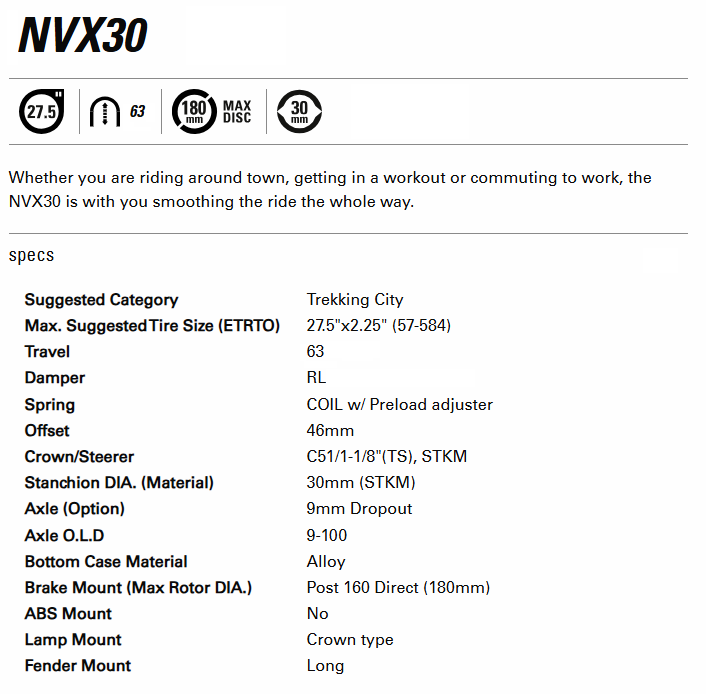 SUSPENSION FORK 27.5, NVX30, RL, COIL Spring. PreLoad Adj, 1 1/8 straight steerer, 9 x 100mm axle. DISC ONLY. 63mm Travel, MATT BLACK